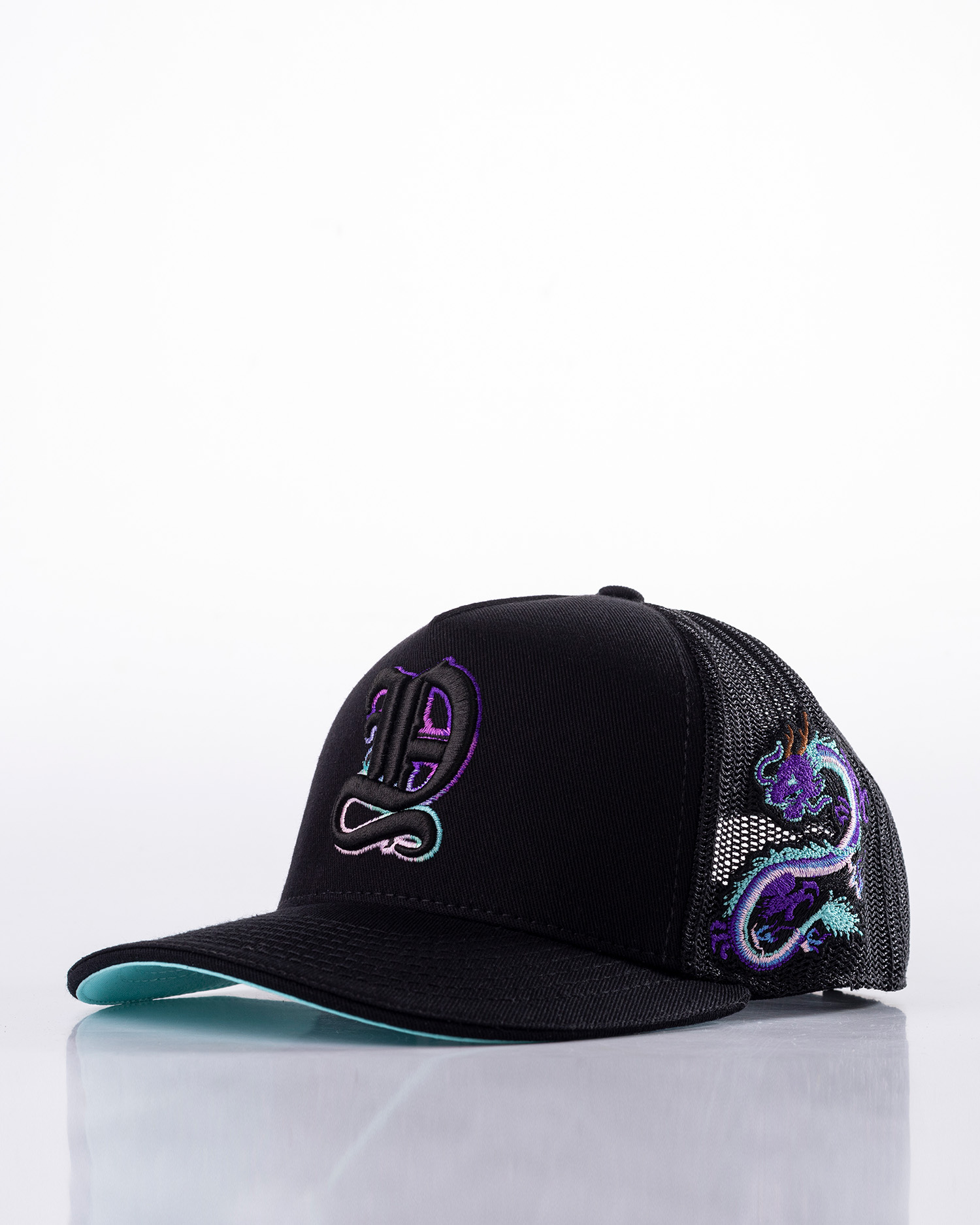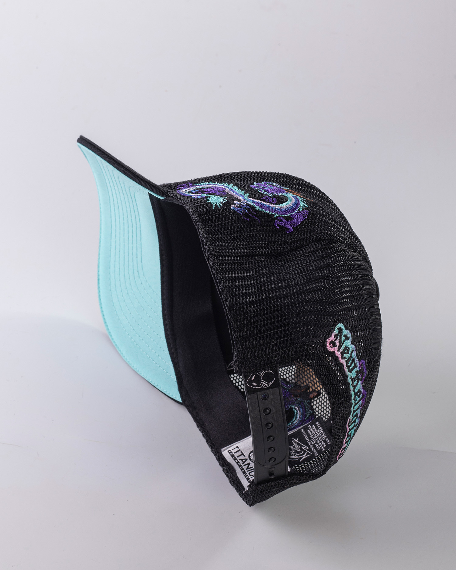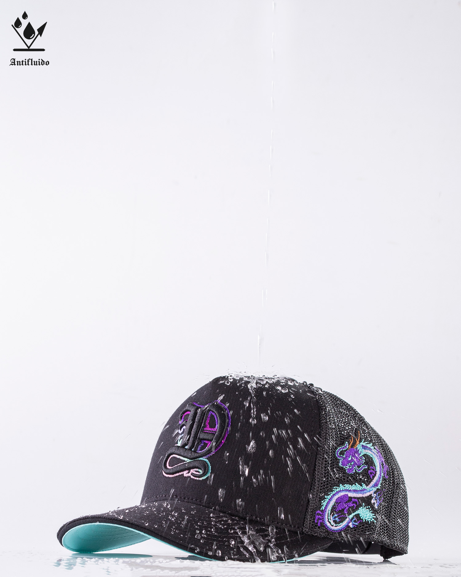 •COLOR: Gorra en color negro y azul turquesa, bordados en negro, morado, fucsia, violeta, verde aguamarina, azul turquesa, rosa y café.