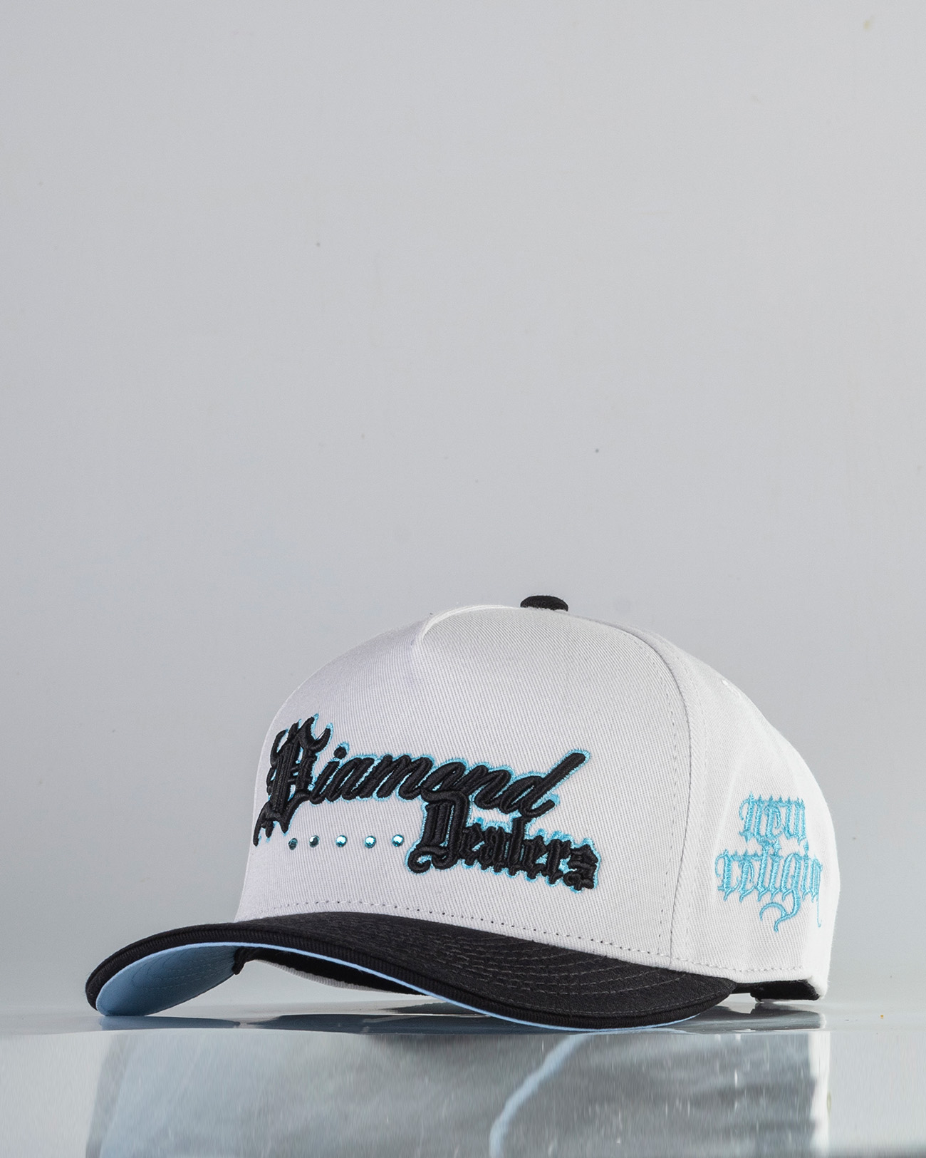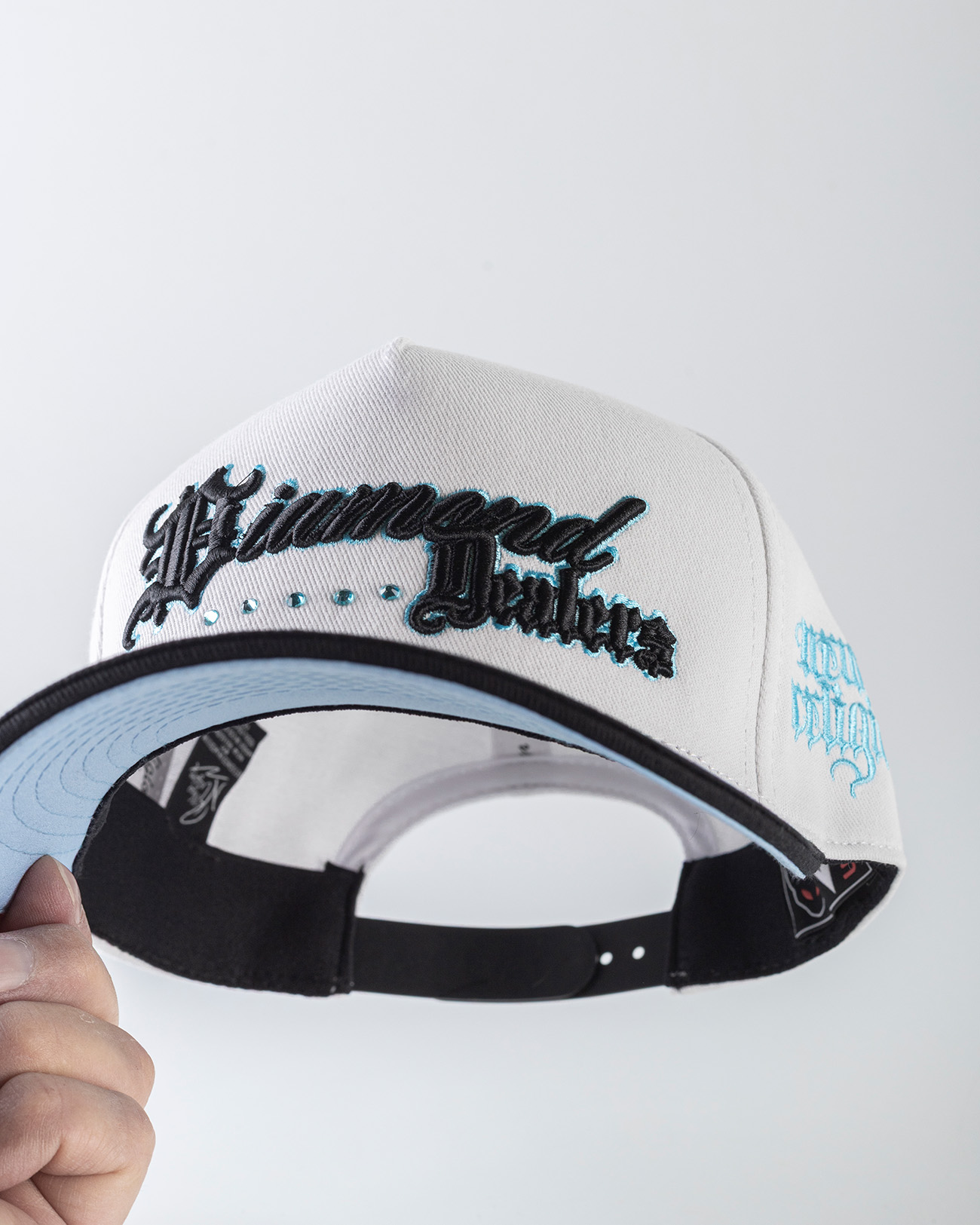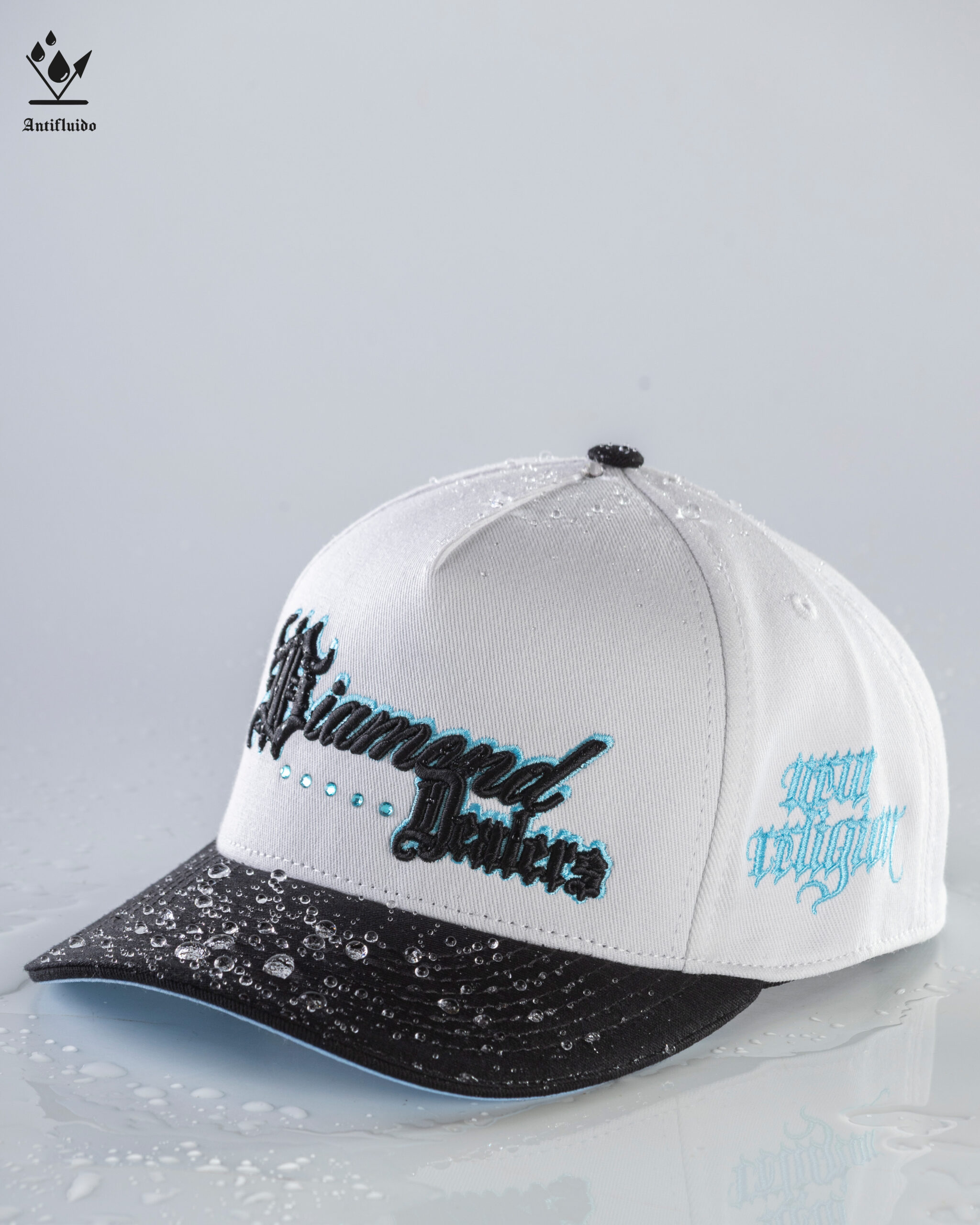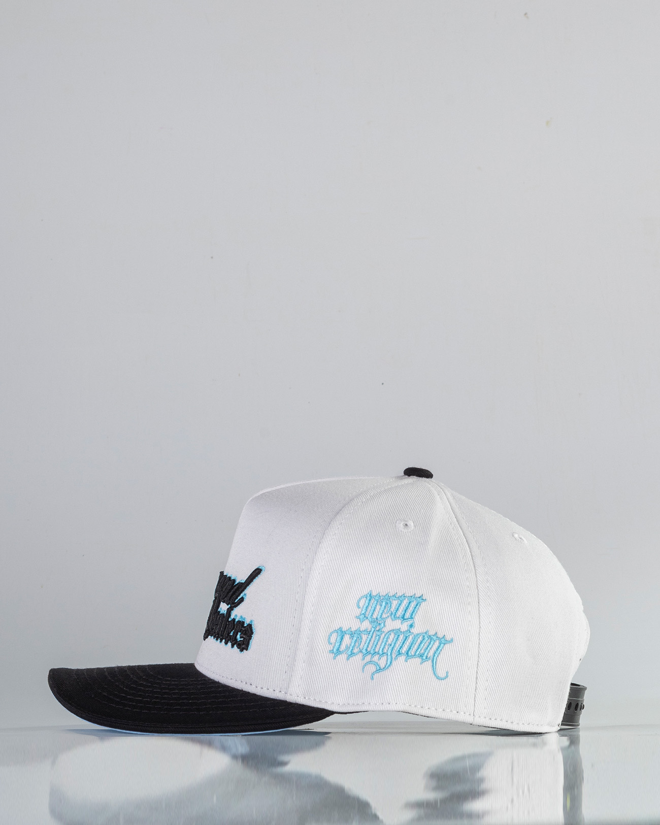鈥OLOR: Gorra en color blanco, negro y azul cielo, bordados en negro y azul luna.