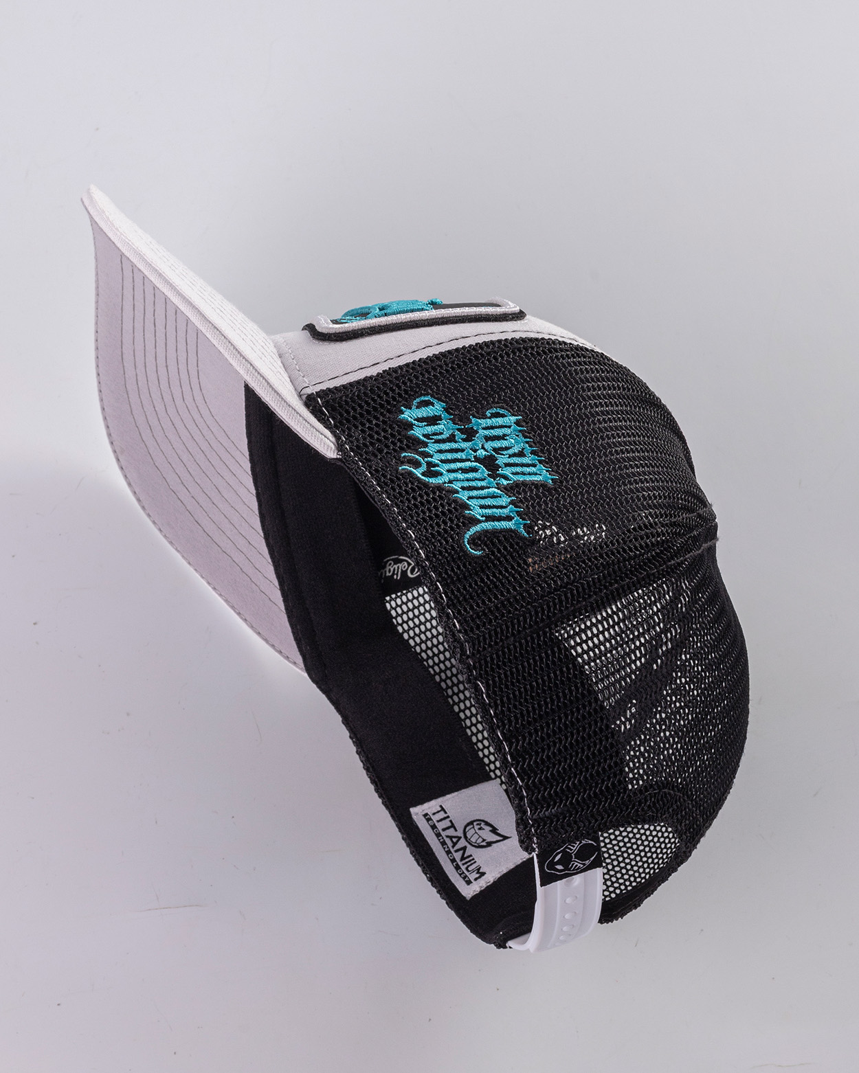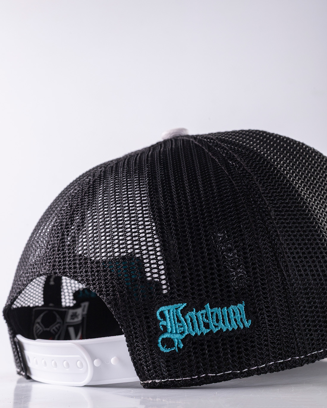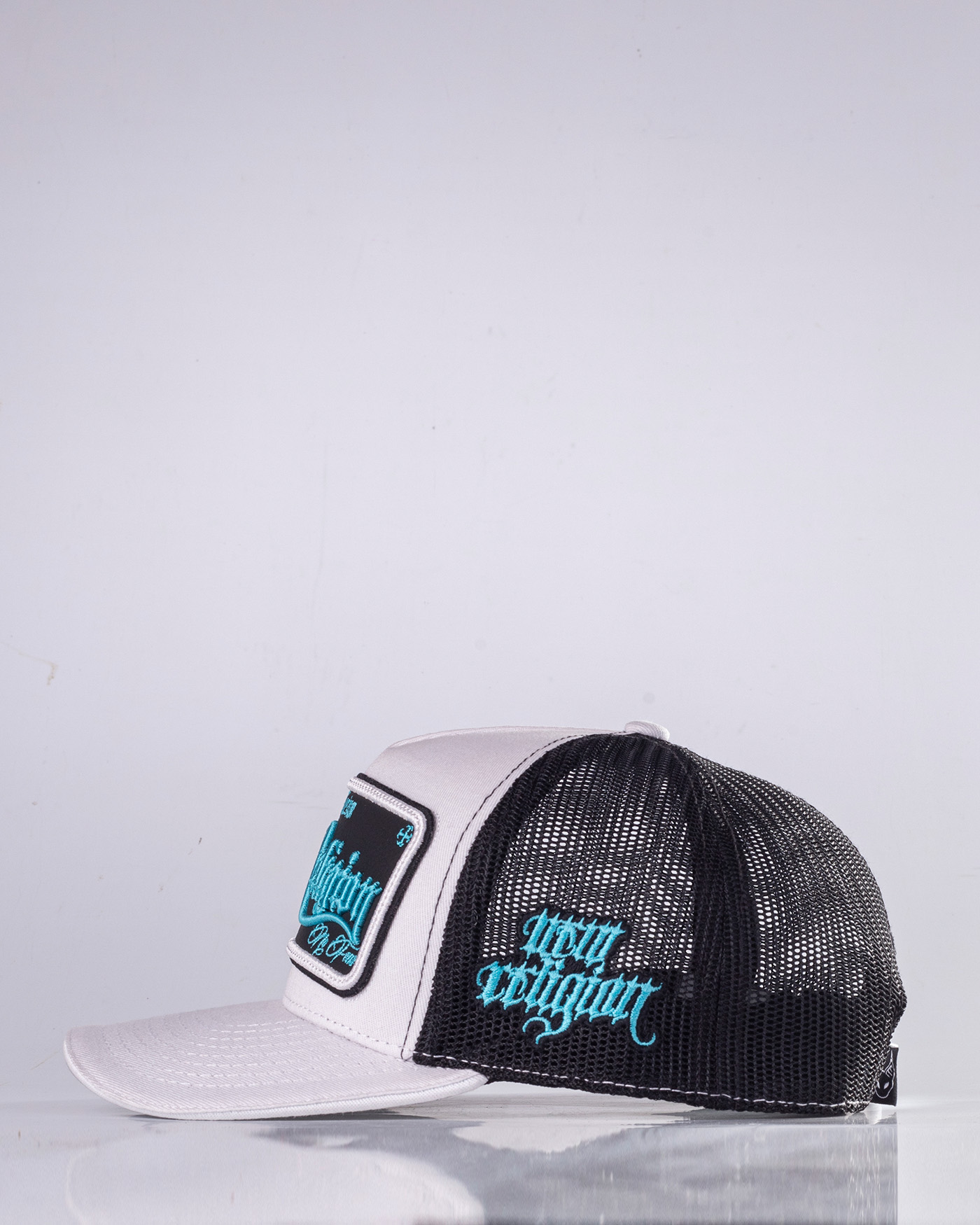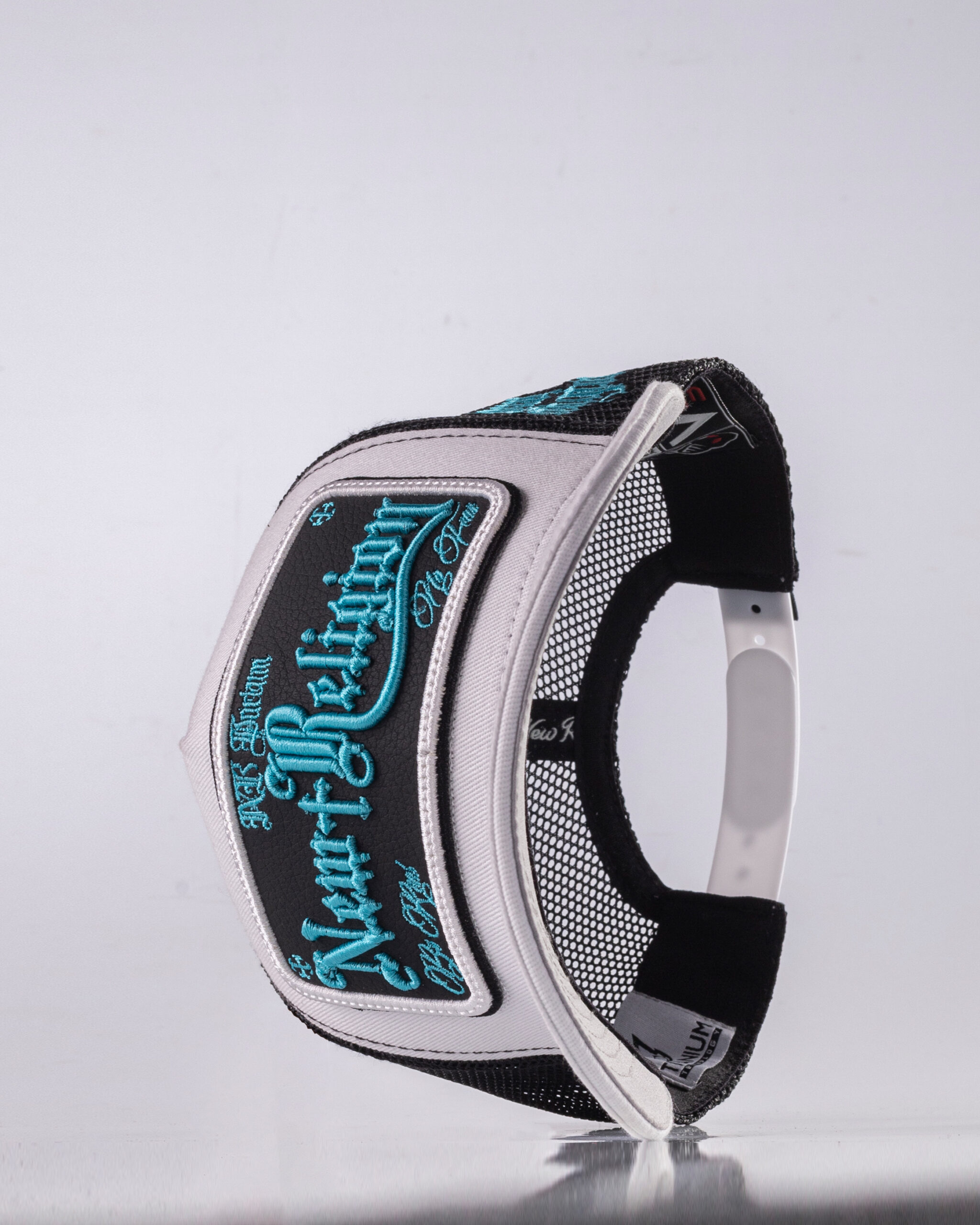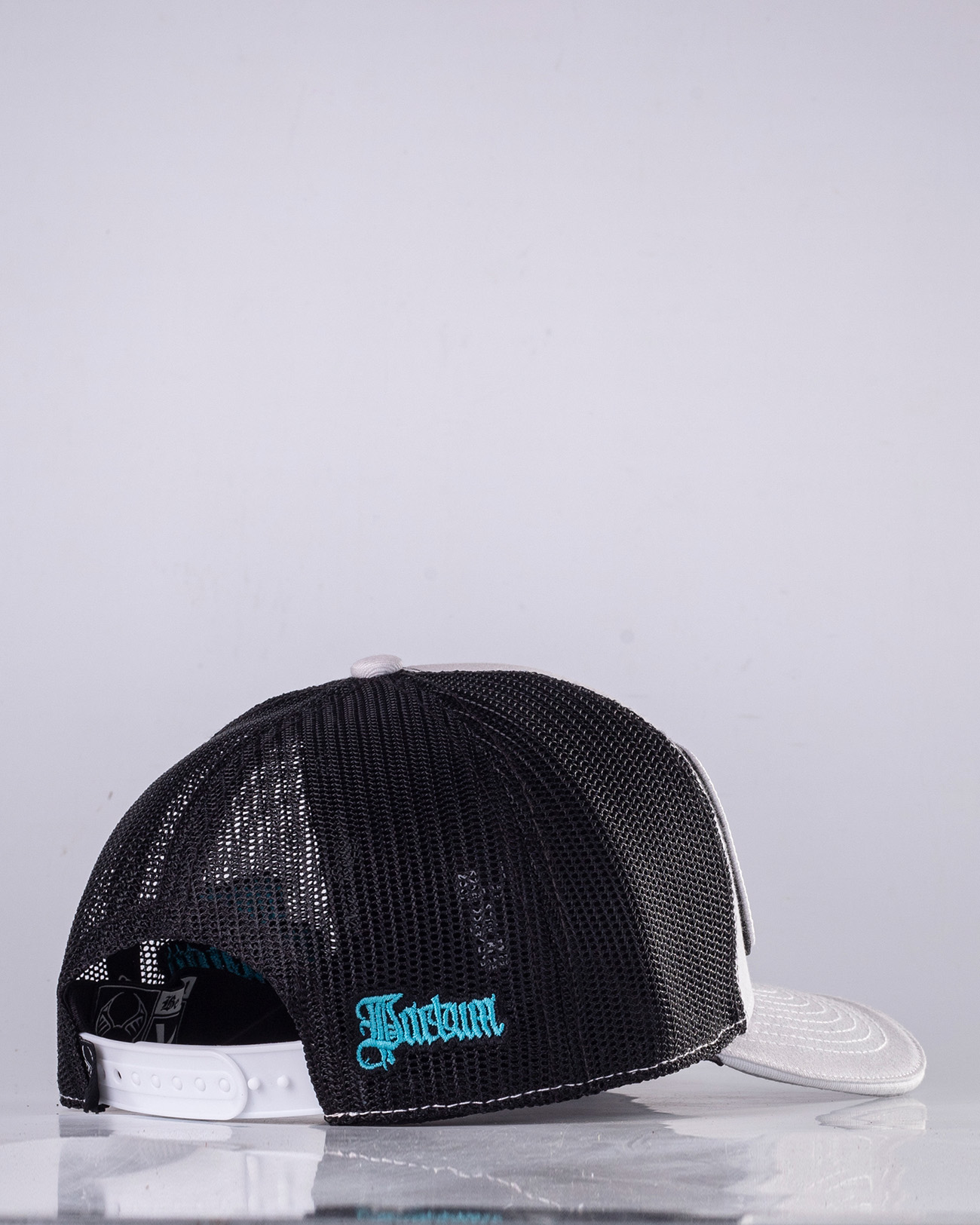 •COLOR: Gorra en color blanco, negro y gris ceniza, bordados en Aqua Ice, blanco y negro.